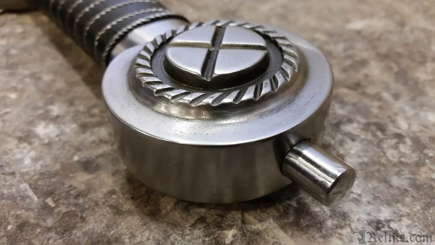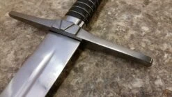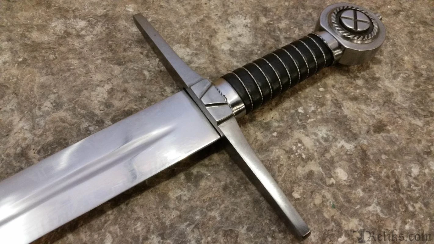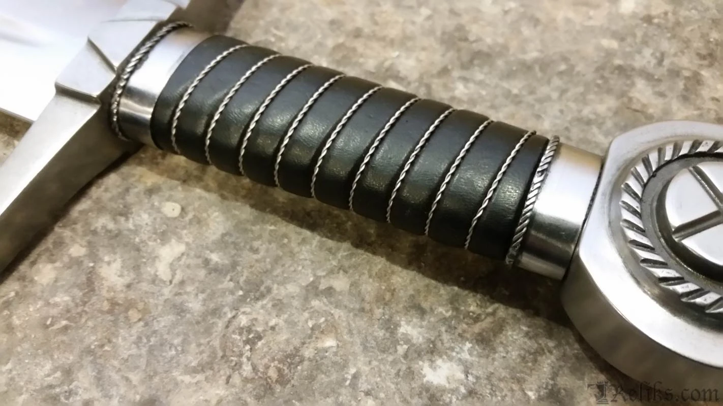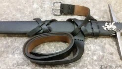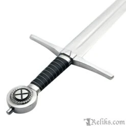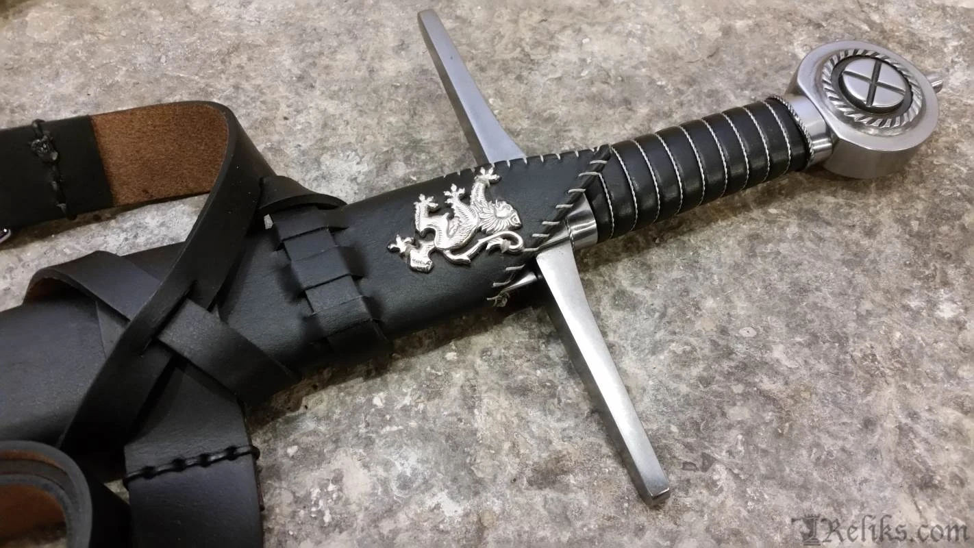 This heroic sword is as powerful as the man who would have wielded it. The master craftsmen of Windlass Steelcrafts have hand forged this blade of high carbon steel. The beautiful pommel emblazons the Cross of St. Andrew, while the hearty grip is wrapped in soft, black leather and held in place by a corded silver chain. This massive sword comes complete with a matching, thick black leather scabbard and sports a silver Lion of Scotland at its throat and a rounded silver metal shoe at its tip. A 1-1/2″ wide belt, measuring 56-1/2″ long, is attached. Comes factory sharp.