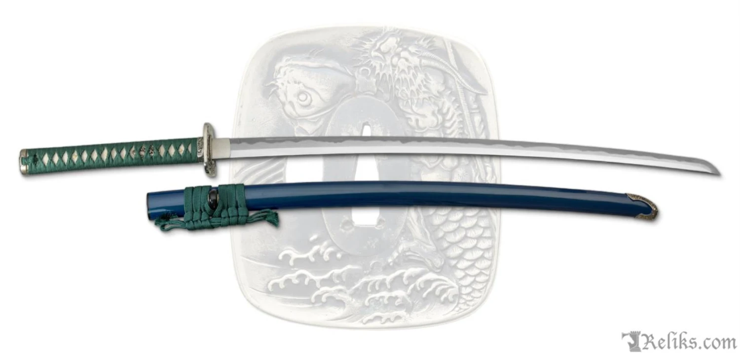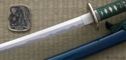 The Taikyu Katana embodies all the elements of endurance in master piece katana. The 27 ½” folded steel blade is a mixture of T10 and 9260 steels to give the hada clear appearance. The blade is light and quick in the hand. The 10 ½” tsuka is wrapped in teal Japanese silk over real same. The deep blue lacquered saya matches perfectly when light passes over it revealing a teal sparked reflection that is almost impossible to photograph. The furniture from the kashira to the kojiri features a turbulent wave them. The Taikyu Katana will please the most discerning collector of high end folded steel katana or those who just love sword art.