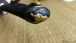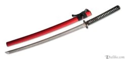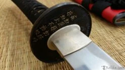 A legend of many names, the Tiger of Kai, Shinano no Kami, and competitor for power to Tokugawa Ieysau , Oda Nobunaga and Uesugi Kenshin, Takeda Shingen commanded respect on the battlefield as well as the political arena. Representing the best and worst of the romantic perception of the feudal lords of the time, Takeda had some of the most forward thinking political ideals as a ruler over his people. Hanwei memorializes Takeda Shingen in steel with this new katana. This classic tsuba depicts Takeda wielding his favorite weapon, the war fan. The blade side of the tsuba features the “wind, forest, fire & mountain” moto of the Takeda clan taken from Sun Tzu which is carried over to the fuchi in gold. The tsuka is wrapped in black cotton around white same (ray skin) kashira with a finely detailed gold tiger on the kashira. Contrasting the tsuka are the gold Takeda mon menuki and the silver seppa and habaki. The 27 1/8” forged steel blade springs forth from textured red saya with black sageo and buffalo horn kurikata and kojiri.