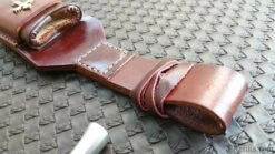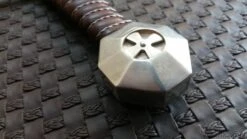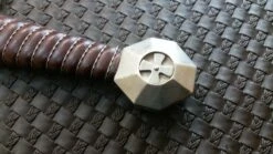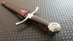 This striking medieval dagger is the matching companion piece to our Accolade sword. The high carbon steel blade has the seal of the Knights Templar on the ricasso, while the pommel has an inlaid cross. All hardware on the crossguard and pommel have been plated in sterling silver, while the grip has been bound in soft leather with a wire wrapping. The leather sheath has been adorned with two silver-plated crosses, has a leather thong for securing your dagger handle and a loop large enough to fit onto your Accolade scabbard belt or any belt up to 2-3/4″ wide. Made by Windlass Steelcrafts.