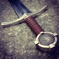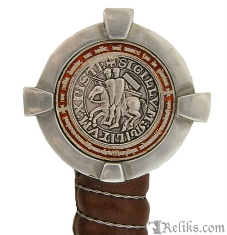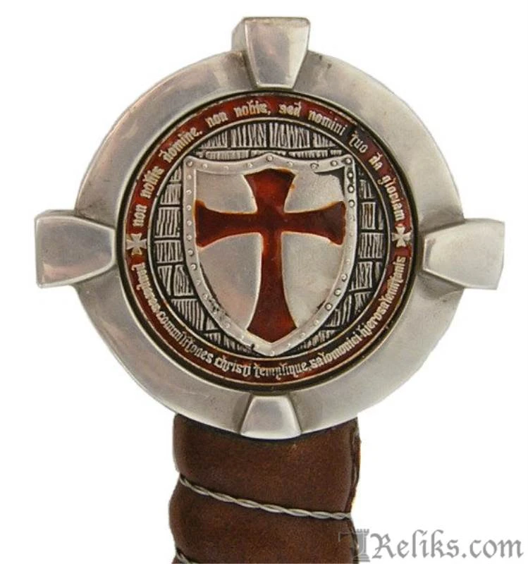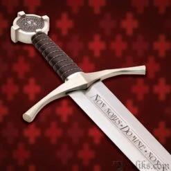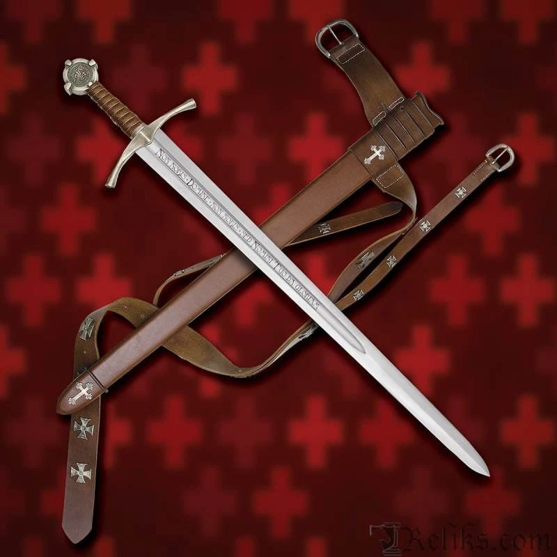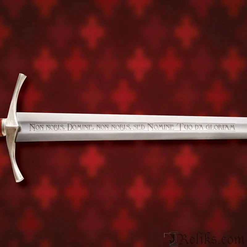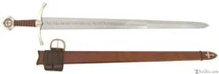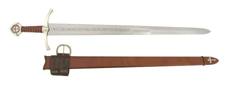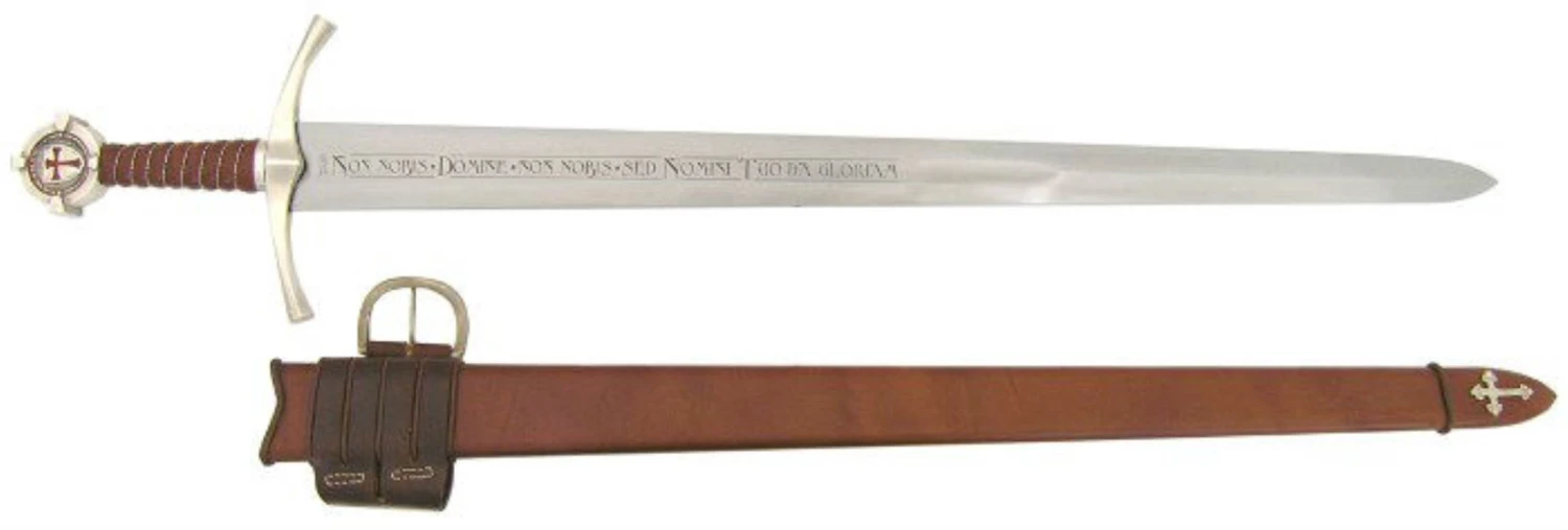 This magnificent sword named The Accolade would have been a sword worthy of the Grand Master to knight a loyal member into this holy order. “Non Nobis, Domine, Non Nobis, Sed Nomini Tuo Da Glorium”. These iconic words engraved on the blade define this historic hand forged sword replica. The creed of the Knights Templar translating to “Nothing for us, Lord, nothing for us but for the glory of thy name” marked their illustrious and sometimes infamous 200 year military influence. The best metalsmiths from Windlass Steelcrafts have spent hours on each blade, hand forging the high carbon steel for optimal balance, quickness and durability. The pommel features a highly detailed Templar coin on each side with Latin inscription and the symbols that have grown synonomous with the Templar Order, while the grip is hand-wrapped with a rich genuine red leather with a wire over-wrap. The sword includes a custom, matching wooden scabbard covered in top grain, heavy-duty leather and a period belt with solid metal fittings. Comes factory sharp.