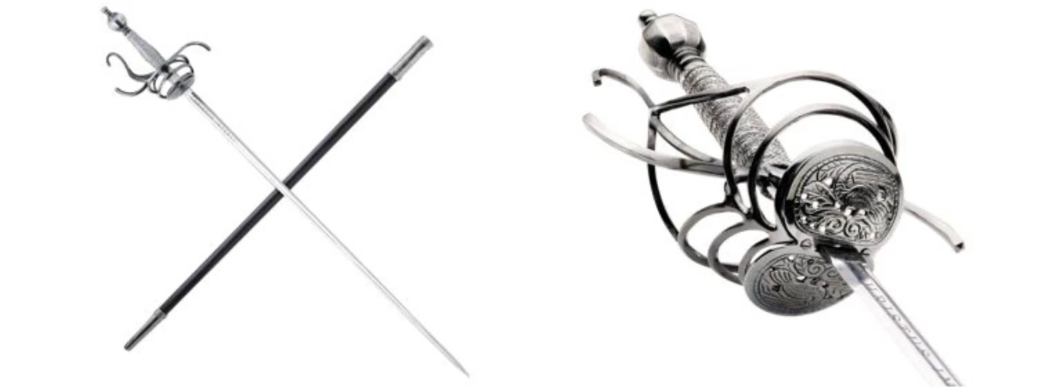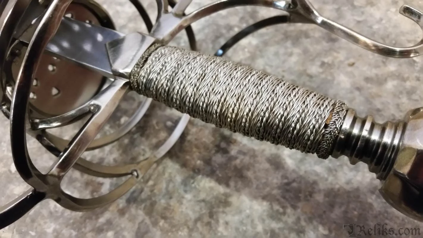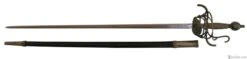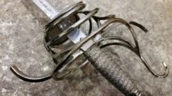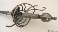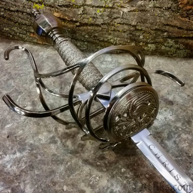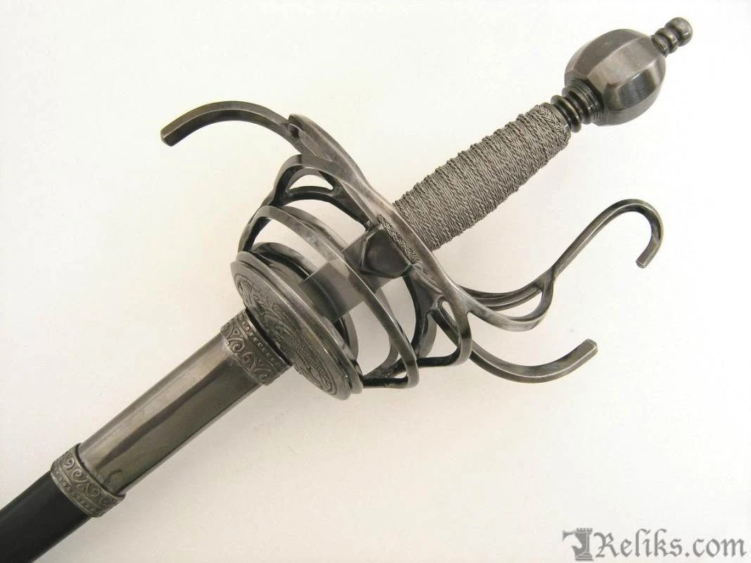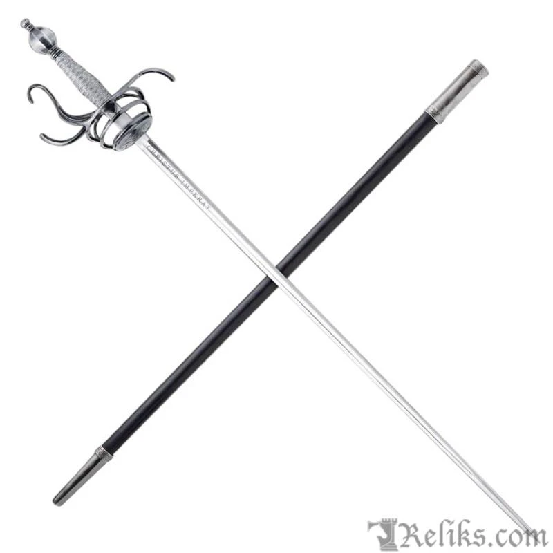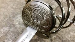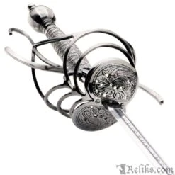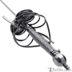 The flamboyantly formed hilt is both beautiful, functional and a testament to the sword makers ability at the Windlass Steelcrafts forge.. Its’ forward steel plates are pierced creating lavish birds amongest foliage. The “S” guard quillions and knuckle guard are slender for both defending the hand and having an upward loop to catch an opponents blade. The heavy pommel pulls the weight back into the wielders hand allows for a more balanced feel and tip control for fighting. The long slender blade is hand forged and expertly tempered to the perfect flex so it can absorb the shock of a powerful thrust without breaking. This rapier comes with a scabbard and can be used for historical fencing or WMA, HEMA.