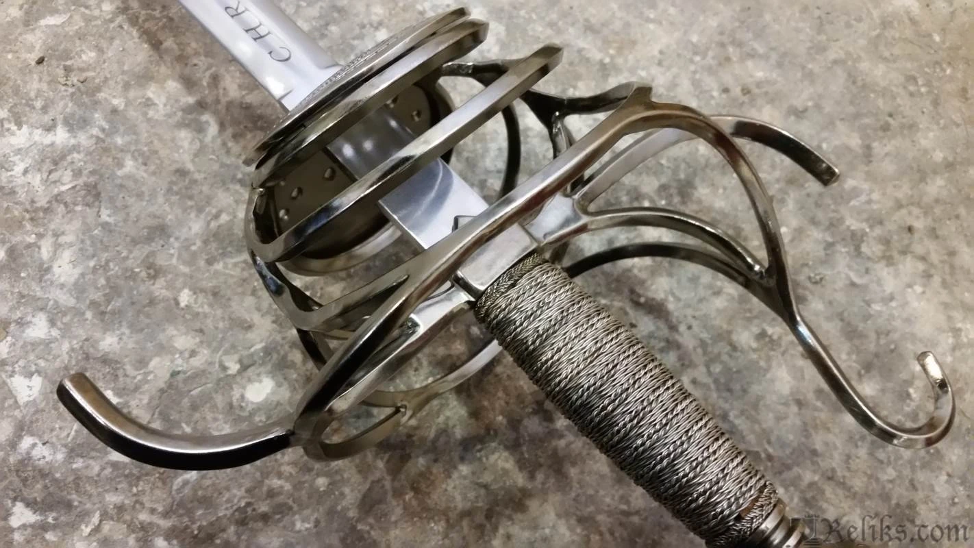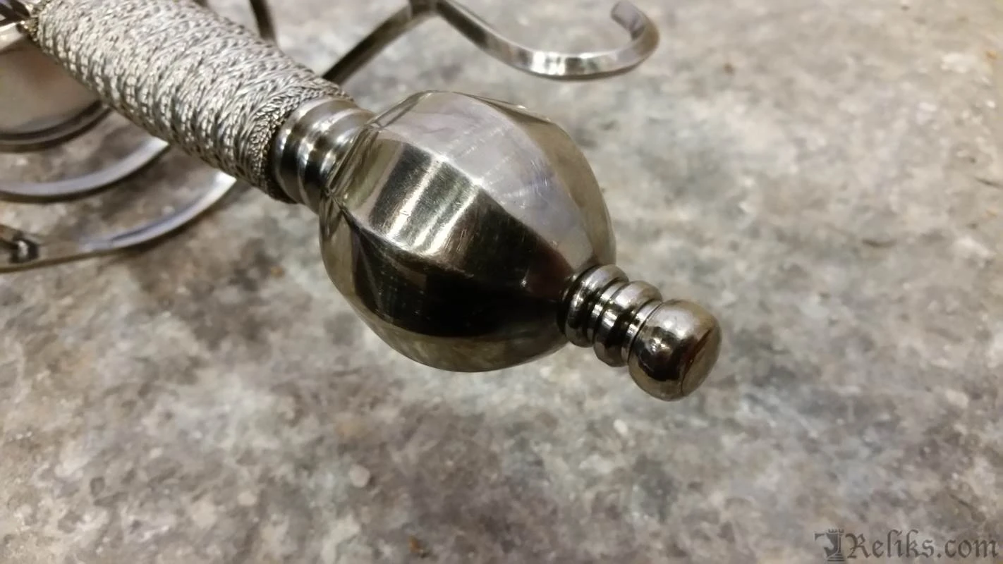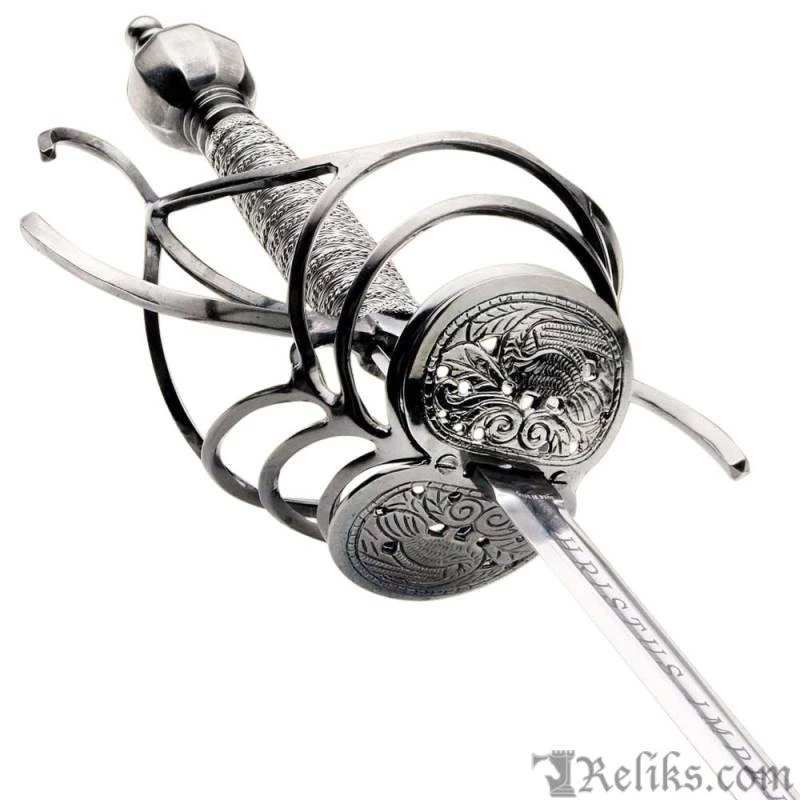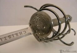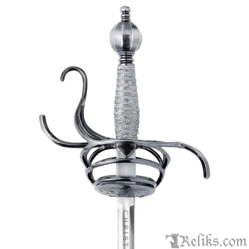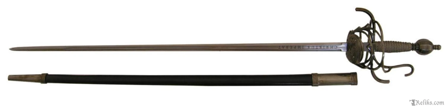 This style of Rapier is very elaborate in design and would have likely been used sometime between 1580-1620 during or shortly after the Elizabethan period. A rapier of this identical form and proportions is currently housed in The Royal Armouries, formerly known as the Tower of London. The dimensions of the sword fall within Elizabethan law where it had been outlawed by Queen Elizabeth herself to carry a rapier with a blade length over 40.5 inches. The blade has is etched on both sides of the ricasso with the Latin phrase CHRISTUS IMPERAT which translates to “Christ Commands”.