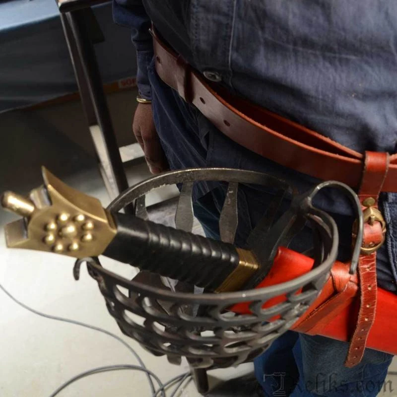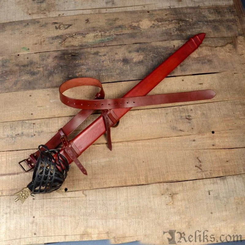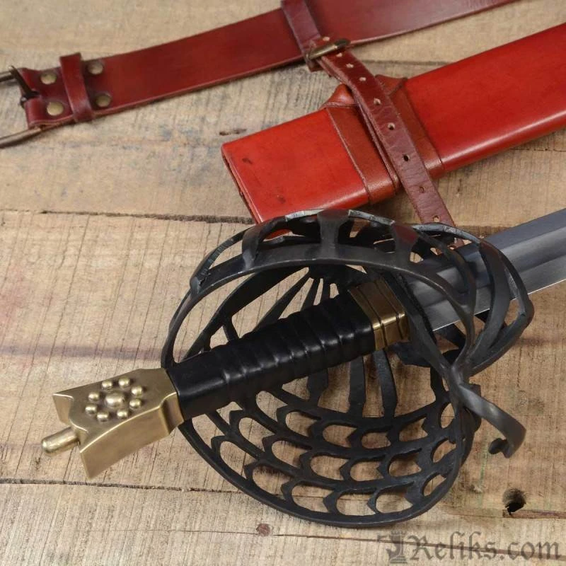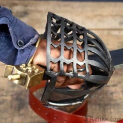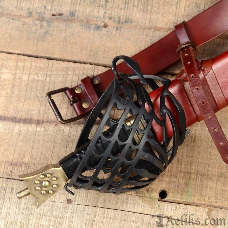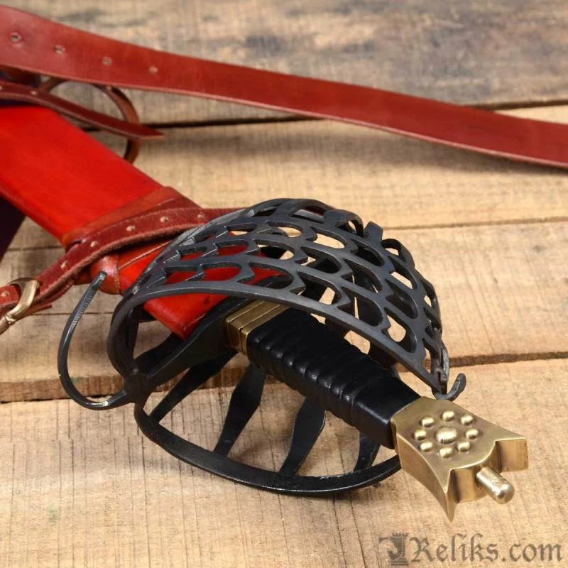 Almost every major arms and armour collection boasts at least one schiavona. They range from highly decorative to bare bone plain. The baskets on the schiavona are made in a great variety of forms, are all excellent protection for the sword hand and wrist. Almost all schiavona have a steel basket and a brass “cat’s head” pommel. It was typically fitted with a double edged blade, that are made for swordplay that utilizes the cut as the main combat tactic. Some of the schiavona blades were so thin it is hard to believe, and back up the fact that this is a deadly cutting sword. The swordsman, armed with a schiavona and buckler, would be hard to stand against, and woe to an opponent armed with a rapier. A beautiful and important sword that saw use throughout Europe. This replica sword of the Palazzo Ducale Venetian Republic is one of the top types of these weapons. Early Schiavona types have been produced before 1600 and making their top type was closed to the annexation of the French army during the Napoleonic wars. The wooden handle is covered with leather.
