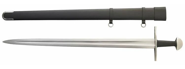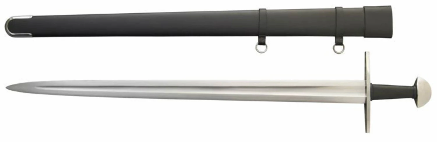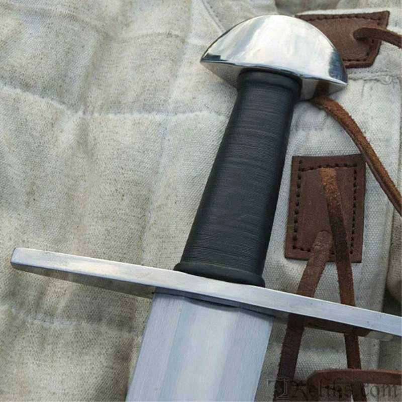 The Tinker Norman sword with it’s distinctive cruciform guards and brazil-nut pommel, is similar in weight and static balance and offer virtually identical handling characteristics to it’s blunted options. The sharp Tinker Norman is harmonically balanced to optimize cutting ability. The blade is forged in 5160 high carbon steel and marquenched to HRc50-52, allowing superior edge retention. grip is wood-cored and leather-covered over a cord wrap. Made by Hanwei. Tinker Approved.