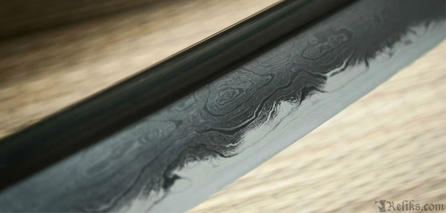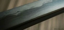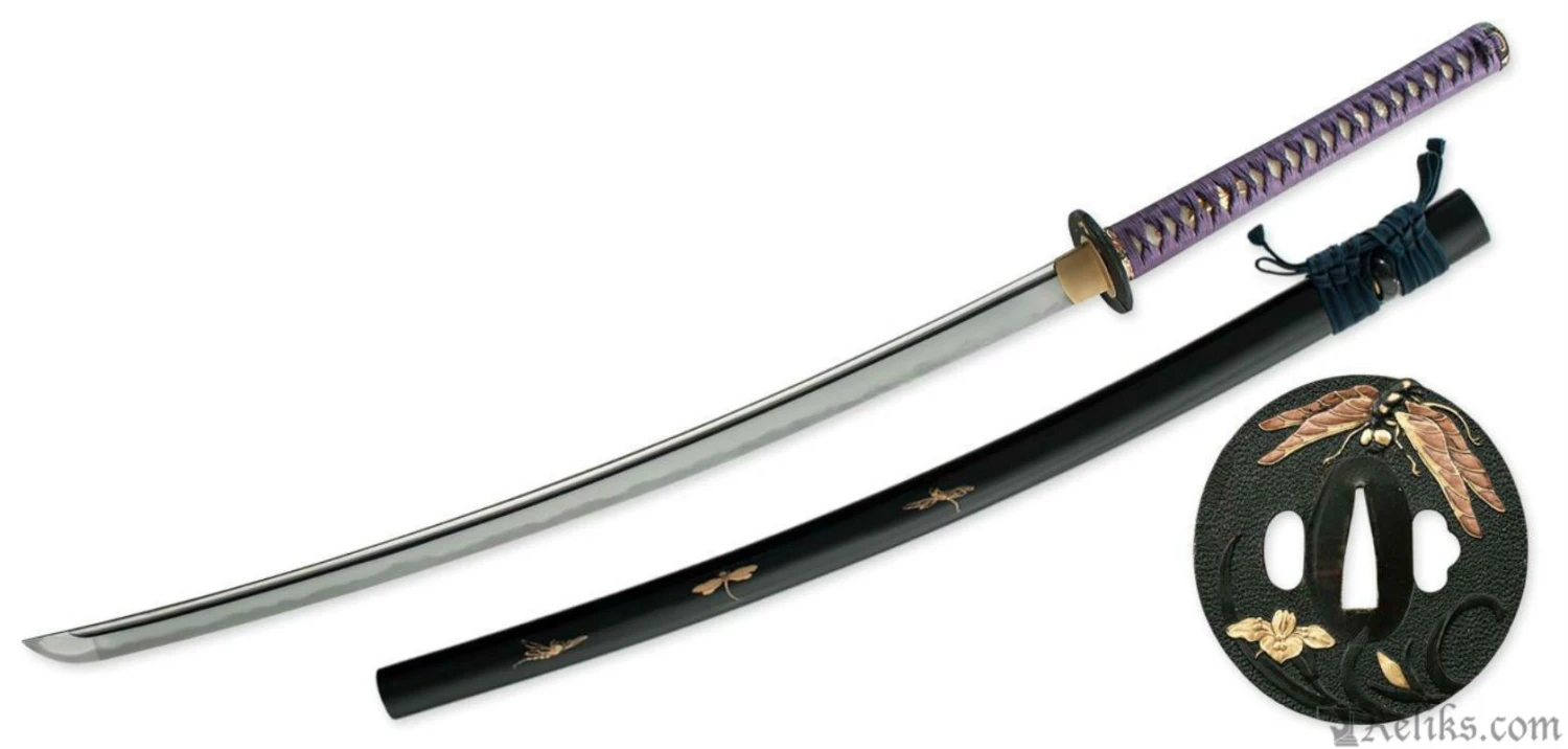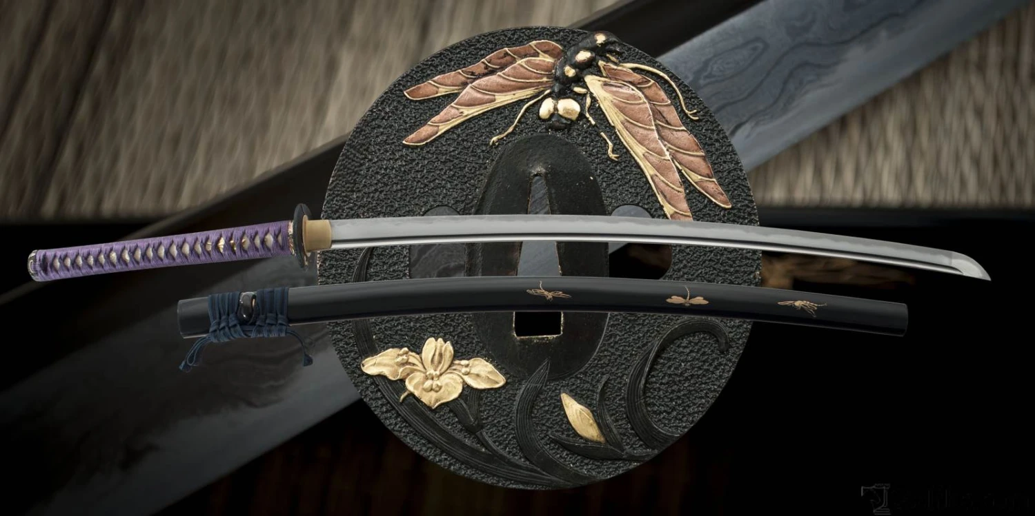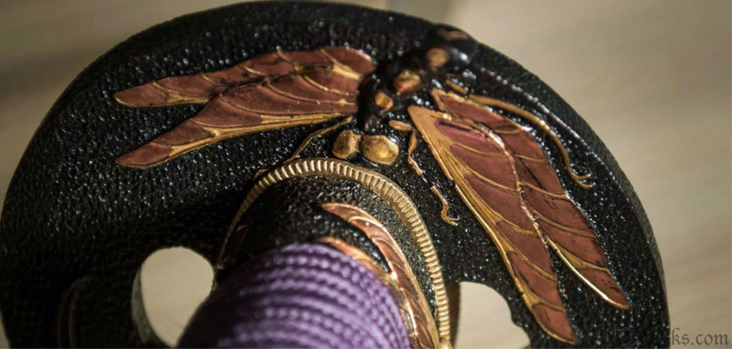 The blade of the Tonbo katana is hand-forged and folded from powder steel. It is forged with a with a medium-length (chu) kissaki. The saya is a deep black lacquer featuring gold dragonflies. High quality ray skin (same) is used on the tsuka. The tsuka-ito is made of premium purple Japanese cotton. The tsuba is crafted in black iron, with detailing in gold and bronze and an exquisite dragonfly scene decoration. The silk sageo compliments this piece and is elegently woven in dark blue and black. The fuchi and kashira are black and with bronze and brass detailing, and the kojiri, koiguchi and kurikata are of polished buffalo horn. The habaki is a one-piece brass construction.