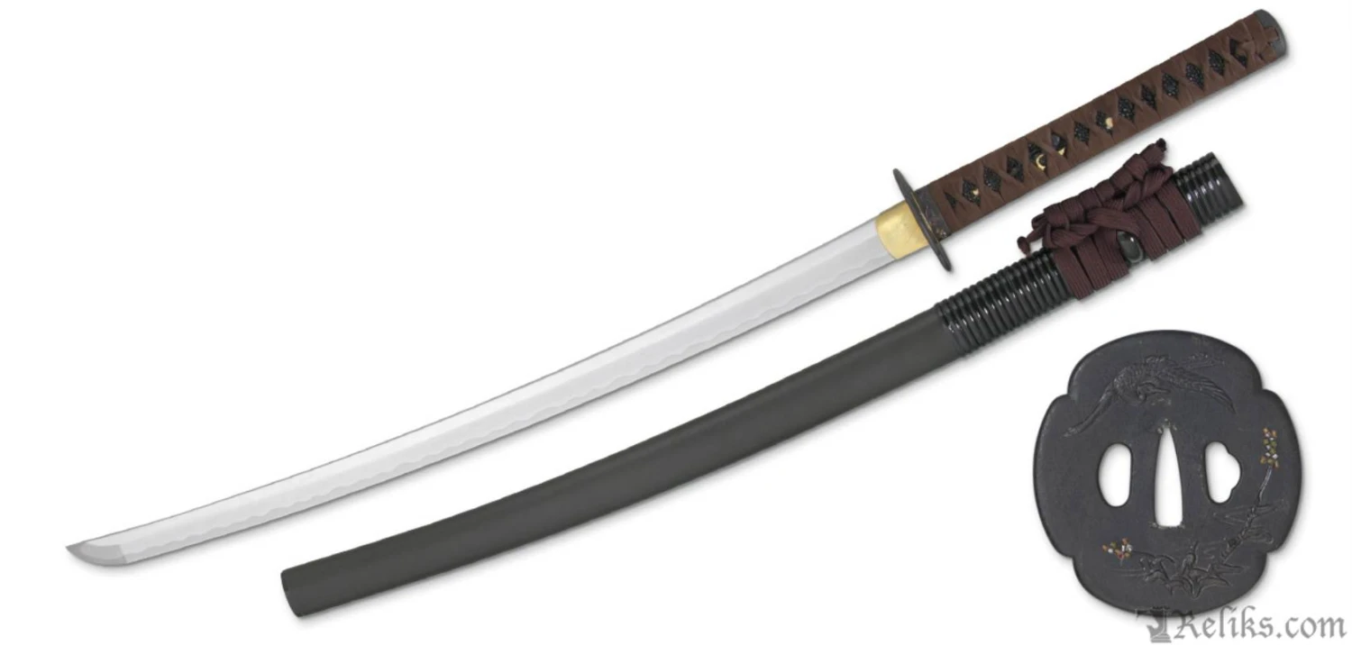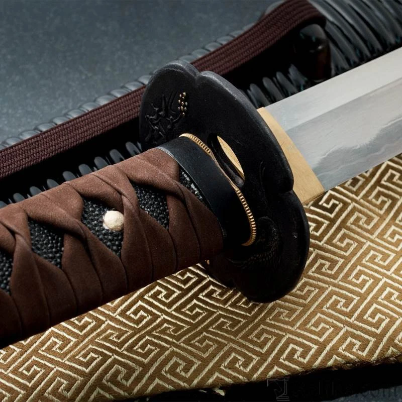 The Tori Elite Katana from Hanwei combines truly elegant furniture and a powder-steel forged and folded blade with the functionality of our Performance Series swords. Designed for multiple cuts in normal targets, the Tori Elite Katana features a ”Flying Crane” themed Tsuba and Fuchi/Kashira with Kabuto inspired Menuki. The high quality brown leather Tsuka-ito is wrapped over black Same. The Saya is wrapped at the mouth with black-lacquered rattan and finished in a textured brown. This sword is built for the Martial Artist who will be performing frequent cutting and advanced drawing practice. Our Elite Katana blades embody the classical design elements of the most prolific sword design in history. With their strong Shinogi Zukuri shape that accentuates the differential heat treatment, these blades are traditionally proportioned to appeal to the collector but they will also perform well in general cutting of hard or soft targets.