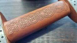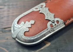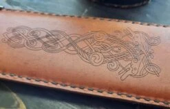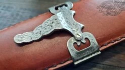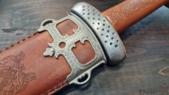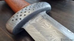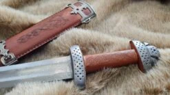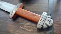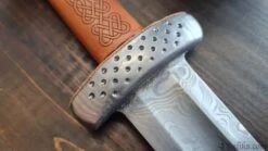Hanwei continues to push the envelope with its forging capability in the Trondheim sword, produced as a one-piece forging in pattern-welded high-carbon steel. Patterned after swords that have been discovered in the area around Trodheim, Norway, the sword exhibits early ninth-century styling, a time when the Norwegian Vikings were pillaging Britain and Ireland. The beauty of the blade is matched by the grip and scabbard, both of which are wrapped in top-grain leather, engraved in a classic Viking motif. The pommel and guard are forged as a part of the blade during this one piece construction forging. They are not removeable or assembled like most other swords.