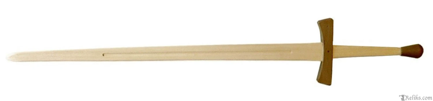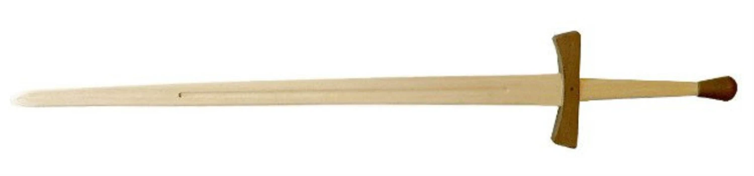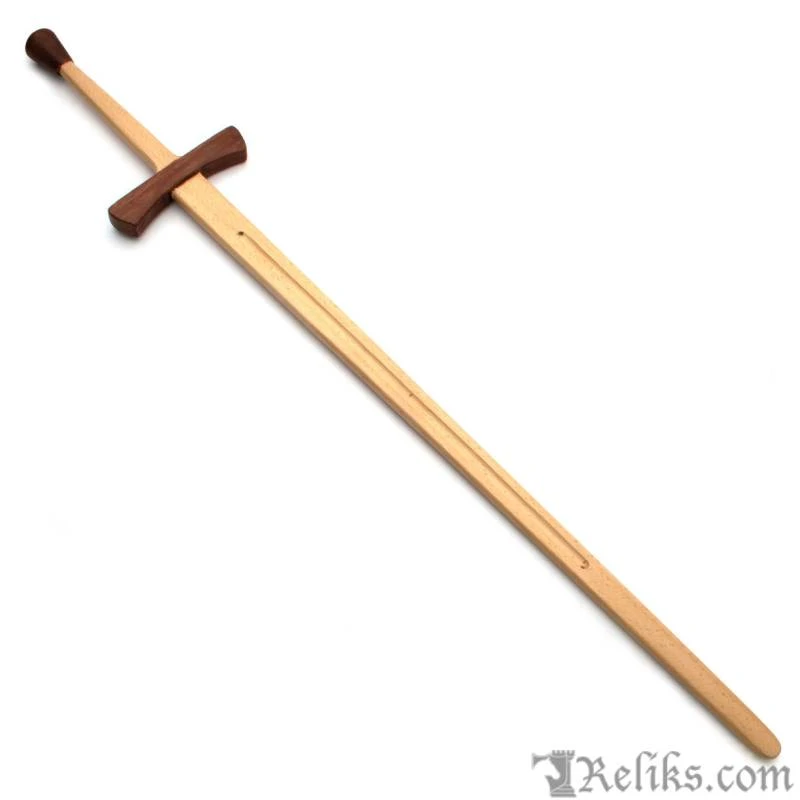 Wooden practice weapons are able to withstand rough use while preserving the steel weapons for battles to come. A wooden sword is also useful for another reason – if it makes contact with another person, they would not be badly injured as they would if practicing with steel. This, combined with the obvious wear and tear that is saved on valuable steel blades, make wasters popular instruments for teaching fencing. Our practice weapons are hand-crafted of fully seasoned steamed beechwood. With a contrasting wood guard and pommel, they are strong enough to meet the needs of today’s swordsman or woman. These can take the abuse of sparring and re-enacting, even edge-to-edge. Keep in mind, however, that wood can break along the grain. This sword design represents edge weapons common from the 12th to 15th centuries. Made by Windlass Steelcrafts.