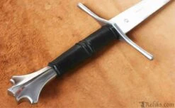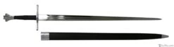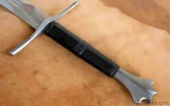 The Two Handed Medieval sword, was very popular in Germany during the mid to late 15th century. As the Middle Ages progressed, this versatile Sword continued to evolve according to the battlefield requirements of the day. The dedicated cutting designs of the 13th century gave way to the thrusting oriented swords of the late Medieval Era. By the Gothic period, the type XVIIIa two handed sword, with its rigid diamond shaped needle tip blade, became the most essential part of the medieval Knights arsenal. The hollow ground sword blades were not only capable of powerful cuts, but offered exceptional advantages with their keen ability to piece through the ever developing plate armor. Not only did the fifteenth century longsword possess a blade profile that allowed for effective thrusting, it also retained a large measure of its earlier ancestors cutting ability. The simple, yet elegant simplistic geometry of the sword reflects the Gothic artistic revival that not only inspired bladesmiths and armorers but also architects and painters of the period. The deeply hollow ground blade and clean hexagonal quillions and fishtail pommel attest to this artistic revival. Swords during this period were not only exceptionally engineered, but also reflected clear artistic patterns and influences from the gothic architectual structures of the time. Hence, the Two Handed Gothic medieval sword, and thus Type XVIIIa medieval battle ready swords, were not merely weapons of war, but beautifully crafted artistic pieces in their own right. The Two Handed Gothic battle ready Sword, is our staffs top pick. Not only for its elegance and simplicity, but its superb handling characteristics. This medieval sword is light, superbly responsive and very well balanced. Authentically crafted from the original at the Landesmuseum (Museum in Zurich), the Two Handed Gothic Sword is a testament to the superb skills and craftsmanship of the later part of the middle ages. Elegant, resilient and reliable, the two handed gothic sword is a heirloom-quality medieval sword for the ages. Skillfully engineered and individually crafted, the two handed medieval sword will surprise even the most discriminating collector. Available with Standard or Interlaced Sword Belt Scabbard.