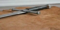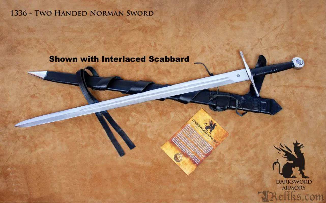 The Two handed Norman Sword, Known for its crucifix form, is the quintessential medieval sword. Presented in the Bayeux Tapestry: an embroidery that depicts the Norman Conquest, the Norman Sword, classified as type XI with elements of type XIIa, is elegant in its simplicity. The Normans (also called Northmen or Norsemen) were the descendants of the Scandinavian Vikings who raided the European coastal settlements at the outset of the 8th century. Despite the Normans conversion to Christianity and their adoption of Frankish way of life, the Normans retained many of the traits of their Germanic ancestors. Working on the Two Handed Norman Sword was a Challenging endeavor. Given the historical significance and popularity of Norman swords, we opted to recreate a Two handed version of the traditional single handed Norman swords depicted in the Bayeux tapestry. The Guard, being very symbolic, served not only as a cross for praying prior to battles and ceremonies, but also as a counter block in combat. The Guard, individually crafted from mild steel and finely shaped with smooth octagonal lines, is further accentuated by the decorated leather wrapped Oak handle.The two handed Norman sword is not only one of our best sellers, it is one of the top “Staff picks” in our collection. Hand crafted and properly engineered for durability in combat, the Two Handed Norman sword, is a very solid, responsive, and perfectly balanced weapon. The blade, hand forged with 5160 High Carbon Steel, is skillfully Dual Hardened for precise cutting while remaining flexible for enduring combat. In a nutshell, the Two handed Norman Sword is a finely crafted sword that is built to last ! Available with Standard or Interlaced Sword Belt Scabbard.