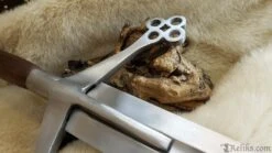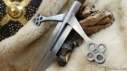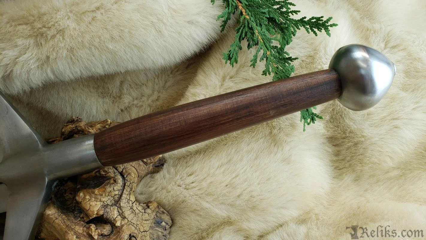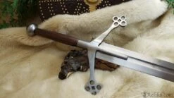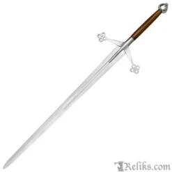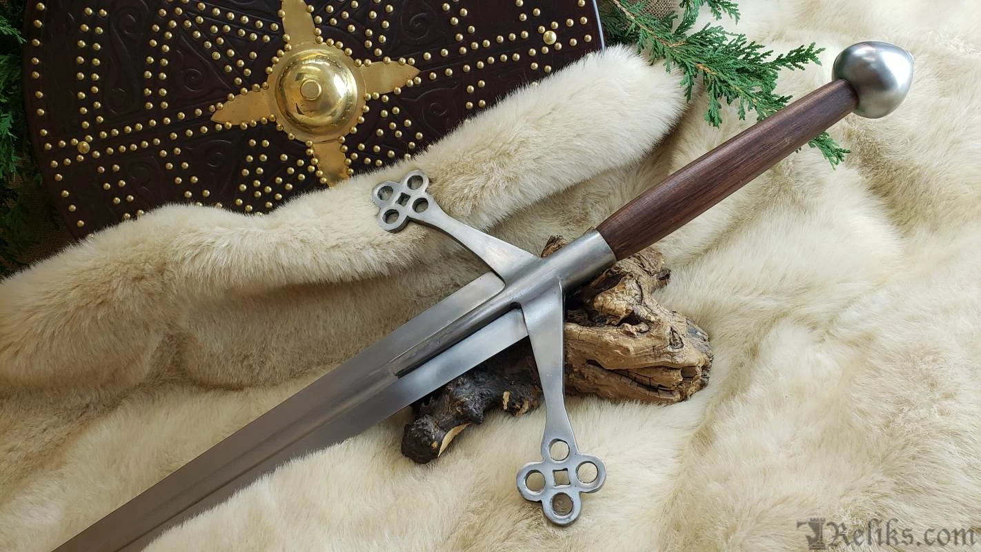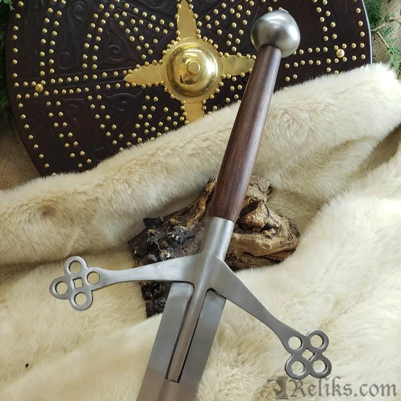 Hailing from the rugged Highlands of Scotland, the Claymore sword stands as an awe-inspiring symbol of valour and craftsmanship. Originating in the 16th century, this mighty weapon features a unique hand-and-a-half length design, boasting a lengthy, broad blade with a diamond shaped cross section and partial fuller. Angling toward the blade, its cross-guard takes on a unique design; one that became emblematic of early Scottish medieval swords. More than just a weapon, the Claymore is a testament to Scottish ingenuity and martial prowess.