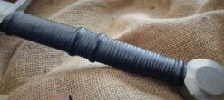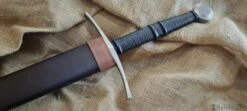 Based on Oakeshott’s Type XIIIa specification these swords were used in the 12th to early 13th Century in that transitional period from hardened leather to mail with some plate armor protecting vital areas of the body. We spent a lot of time discussing with Gus his methodology for developing what he would call a “performance-oriented” sword. Without getting too deep into it Gus, along with Tinker Pearce, was one of the pioneering sword makers to incorporate the notion of harmonic balance into his sword designs. Informed by historical examples and his own experimentation Gus has been making swords for decades now that seem to float in your hand. For this sword Gus left the aesthetics and materials up to us, it was the design (weight, balance, taper, harmonics) we had to get right. It took several rounds of samples (not to mention a botched first run) but we finally nailed it. Not satisfied with just getting the design right we wanted to push it farther. We had the fundamentals down but chose to take the materials and fit and finish a step ahead. The blade is hand forged mono-tempered 9260 spring steel, flat ground with a handsome satin finish. The fittings are high quality stainless steel exactly matching Gus’s design. The grip is a solid wood core, cord-wrapped for strength with a textured leather over-wrap. The scabbard is a solid wood core, with stainless steel chape and stitched leather wrap. Bottom line, these are the best performing production medieval swords available.