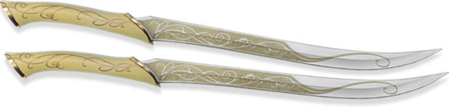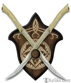 Elves possessed great magical powers, and the ability to create things of immense beauty, craft and enchantment, including weaponry, music, language, and lore. The Daggers of Legolas reflect that beauty, and were the perfect weapon for the “Assassin” Legolas. His skill with these daggers combined with his excellent marksmanship with the bow proved to be the death blow for man, orcs and Uruk-Hai! These deeply etched blades feature a gold tone color and full length tang construction. Handles are made from solid American oak with an Elven vine design and adorned with cast metal guard and pommel. The fighting knives of Legolas from the Lord of the Rings movie measure 22 3/8″ overall each. The plaque is 12-5/8″ x 15-11/16″ x 3/4″ wood, adorned with the badge of the Greenleaf family of Legolas.This is an official release of the Lord of the Rings movie swords.