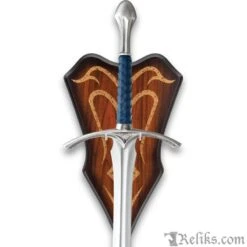 An ancient sword carried by Gandalf the Grey, who is an old, but powerful wizard and friend to Frodo Baggins. He joins Frodo and the other selected members of the “Fellowship” as they cross Middle-earth in an effort to reach Mount Doom and destroy the Ring. Glamdring, a magical sword, glows in the presence of an enemy and it serves Gandalf in his mission to aid the Fellowship of the Ring. It was made by ancient Elves, and is inscribed with runes in the Elven language that say the sword was forged for Turgon, the King of Gondolin. Genuine leather wrapped grip. This is an official release of the Lord of the Rings movie swords. It is presented with a wood wall display and includes a certificate of authenticity.