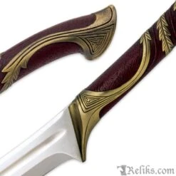 This officially licensed and superb quality reproduction item is an exact replica of the High Elven warrior sword that appears in the opening battle sequence of The Lord of the Rings movie trilogy. Measuring 49 3/4″ overall, this elegant and deadly sword features a 24″ tempered, 420 stainless steel, false edged blade. The precision cast metal handle offers a simulated leather grip accented with brass-plated Elven vine designs. This item includes a 23″ x 9″ x 3/4″ wooden display plaque with silkscreen design and a certificate of authenticity.