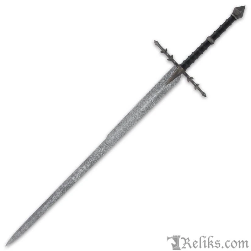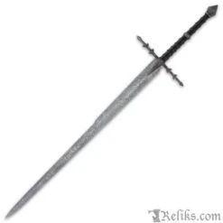 Ringwraiths, also called Dark Riders or the Nazgul, are the shadow servants of Sauron. There are nine of them to represent the nine mortal kings that Sauron corrupted with his Ring of Power. They can sense when the Ring of Power is near and can see the Ringbearer even more clearly when he puts it on. The Ringwraith’s sword was built by armorers of the dark land of Mordor, under the command of their evil master Sauron. This authentically detailed replica is a reproduction of the actual filming prop built by Weta Workshop and used in “The Lord Of The Rings” films presented by New Line Cinema. This massive sword features an authentic battle-worn solid metal crossguard and pommel, genuine leather-wrapped grips and a rat-tail tang construction. The 39 3/4” acid-etched, tempered 420 J2 stainless steel blade is false-edged and has a thickness of 1/4”. Included is a 10”x 13 7/8”x 3/4” wooden display plaque silk-screened with the mark of the Eye of Sauron, master of the Ringwraiths. Also included is a parchment certificate of authenticity verifying its officially licensed collectible status.