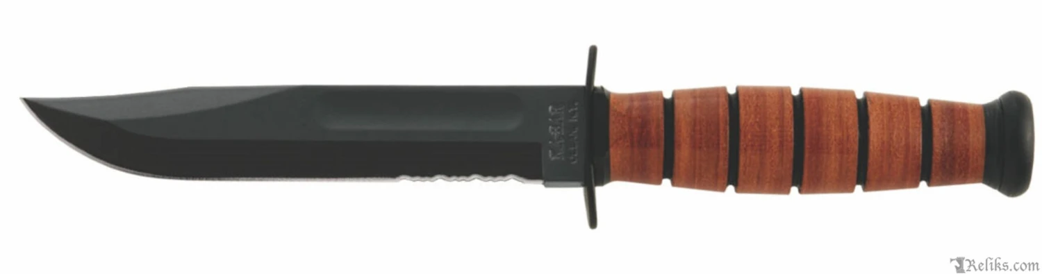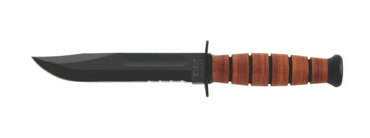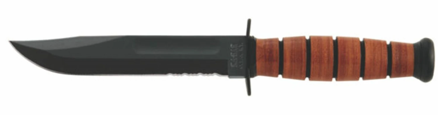 A partially-serrated edge makes this compact version of the traditional KA-BAR even more versatile. Blade length 5 1/4″, Overall length 9 1/4″. 1095 Cro-Van steel blade with a Rockwell Harness of 56-58. Handle is constructed of stacked leather. Includes brown leather sheath.