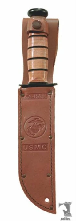 The most famous knife in the World gets updated with a serrated edge to better cut synthetic and looped materials. 1095 Carbon Steel with a Rockwell Hardness of 56-58. Handle is constructed of stacked leather. Includes USMC stamped brown leather sheath.