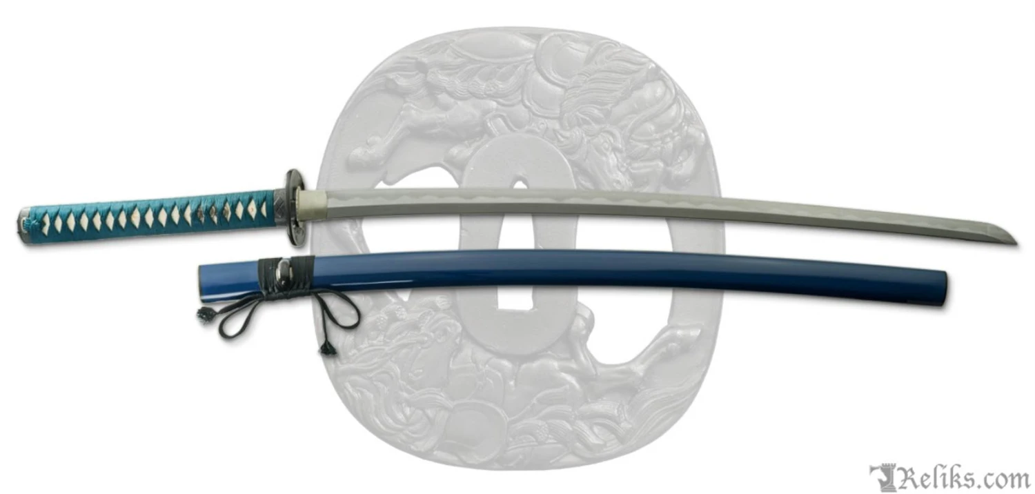 The earth trembles and the air thunders as thousands of hoofs strike the ground over the horizon. The tranquility of the emerald sea nor of the clear blue sky shield you from the destruction galloping toward you as battle nears. Much like the War Horse Katana, the beautiful colors of the emerald tsuka over white samegawa. The deadly sharp steel blade nestled in the deep blue saya. The forged 65Mn steel blade features true clay-tempering that produces a distinctive hamon. The traditional polish brings out the real hamon and a mirror shinogi-ji (flat section). The HRC 60 edge and HRC 40 back are ideal for cutting if you wish to try this pony in the field. The blackened tsuba features two rider-less horses chasing each other in the endless human condition of warfare. The silver menuki represent the Tokugawa and Oda clans whereas the fuchi and kashira feature the Takeda and Mori clan symbols. Truly a tragically beautiful katana built for war.