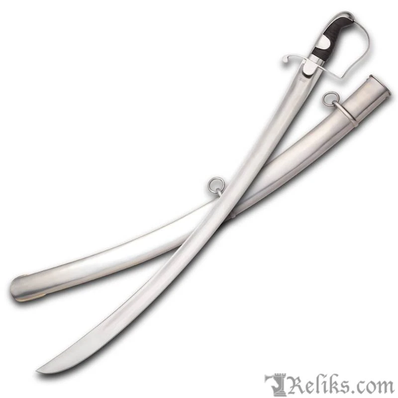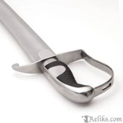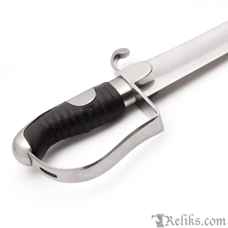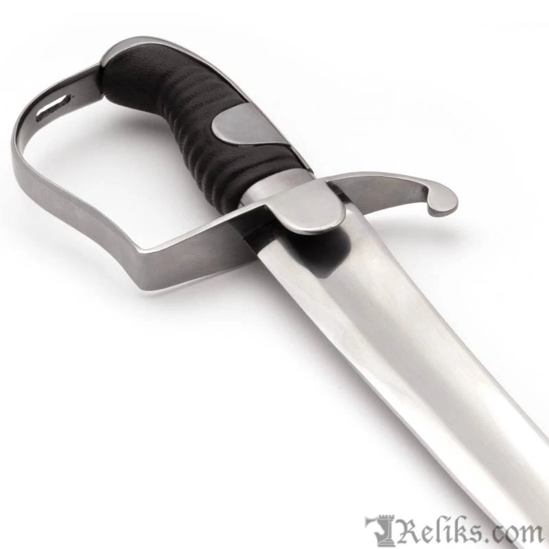 The hilt replicates the originals, with a 5/8″ wide knuckle guard, steel spine, and contoured, ribbed leather grip. Complete with accurately reproduced steel scabbard.