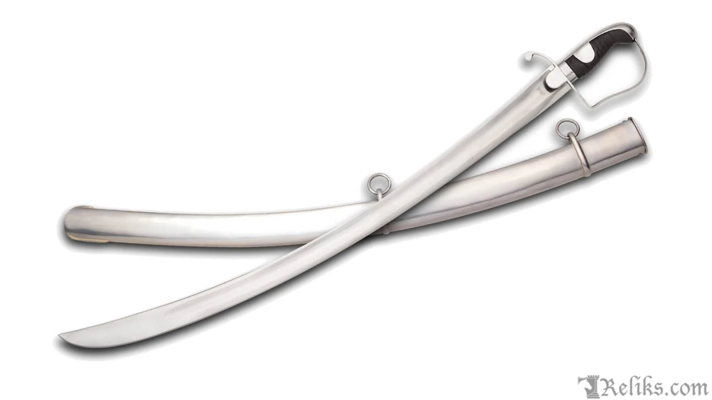 Designed by Major-General John Gaspard Le Marchant, the 1796 pattern light cavalry saber was based on Central and Eastern European hussar swords. As a young captain, he observed the clumsy design of the heavy, overly long 1788 Pattern swords. Le Marchant opined that the “blades of the Turks, Mamelukes, Moors, and Hungarians (were) preferable to any other.” He gave the blade of this saber a pronounced curve, which made it more adept at cavalry attack methods, and designed it with a widened tip that affected the balance, but made slashes far more brutal. It was issued primarily to British light dragoons and hussars and was also used by the King’s German Legion light cavalry during the Napoleonic Wars. The blade profile became so popular that the Prussians and other German states emulated its design throughout the 19th century.