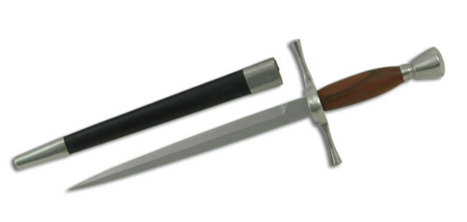 Matching our Wood Grip Rapier, the Wood Grip Main Gauche provides an authentically-styled parrying weapon, with a high-carbon steel blade and a stainless steel hilt (for reduced maintenance). The Main Gauche, or left hand dagger, was often used with the rapier, providing an added dimension in both offense and defense, and the “Schools of Fence” which proliferated in Europe during this period taught the use of the two weapons in combination. The Main Gauche would often match the Rapier in styling, while incorporating features which maximized the effectiveness of the piece.